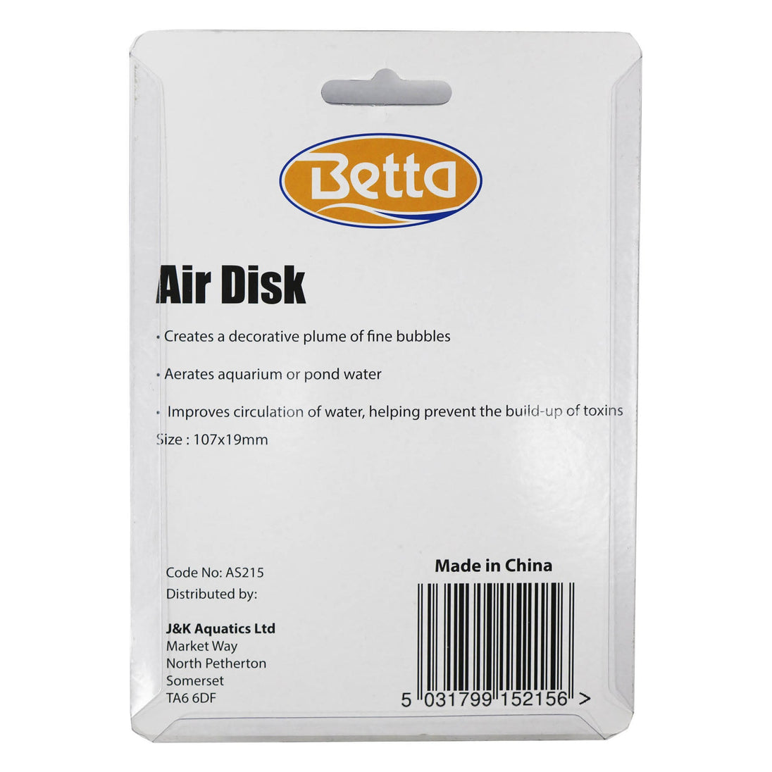 Betta Air Disks are flat air stones suitable for placing on bottom of an aquarium or pond. They create a column of air bubbles to decorate, aerate and improve water circulation. To install, connect to standard (4/6mm) silicone or plastic air line from the air pump and lay anywhere in the aquarium or pond. The stone can be hidden from view using rocks, plants or other decor etc. Recommended for use with Betta Airline Tubing, made from either silicone or plastic.