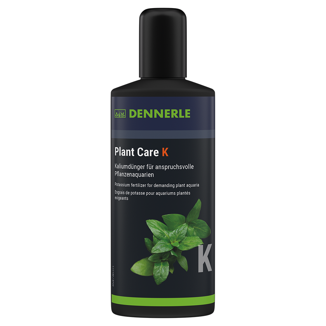 Potassium has a variety of functions in the plant. It is present in high concentrations both in the cells themselves and in the vascular system. Potassium is an osmotically active ion, which is crucial for the build-up of root pressure and cell pressure (turgor). Furthermore, it is involved in various metabolic processes, e.g. the synthesis of sugars, starch, cellulose and lignin. Potassium can be stored in the plant cells and transported within the plant as needed, e.g. from the older to younger leaves. A certain amount of potassium is supplied by tap water. The harder the water, the more, the softer the water, the less. You can ask the local water supplier about the salary. Potassium is only introduced into the aquarium in very small quantities via food and fish excretions. Good aquarium fertilisers (micro-nutrient fertilisers / complete iron fertilisers) such as Dennerle Plant Care Pro therefore always contain an appropriate amount of potassium. For normal, planted community aquariums, this is usually sufficient. In contrast, the situation is different for demanding plant aquariums (e.g. aquascaping aquariums, Holland aquariums). They have an above-average need for nutrients, especially when it comes to macronutrients. Such plant aquariums are characterized by