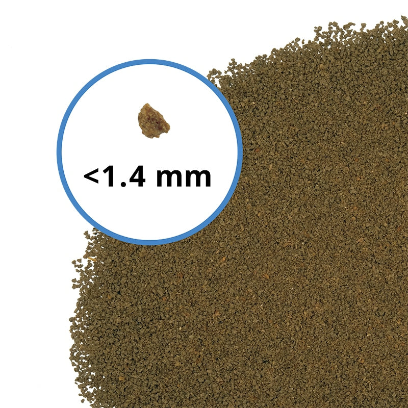 - Slow sinking micro granule format (0.25-1.4 mm) – all fish can feed at their preferred depth