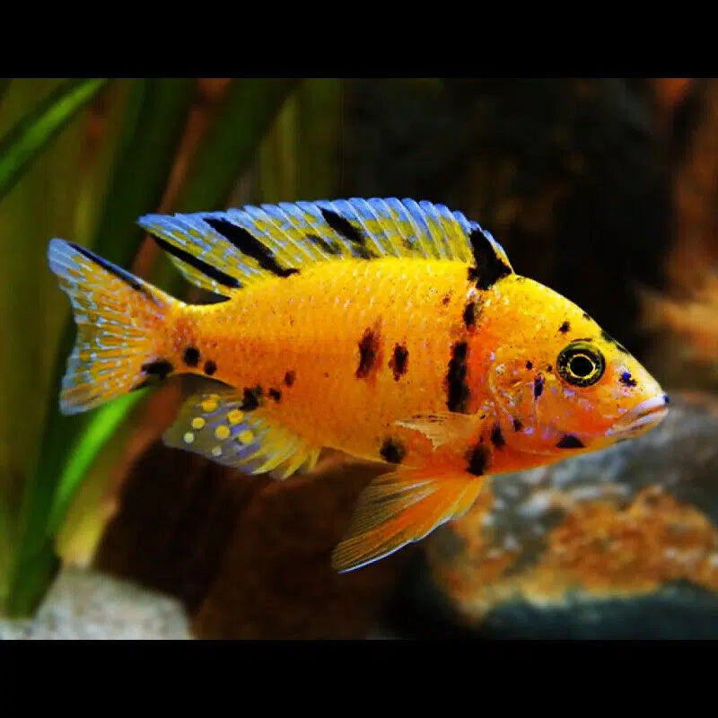 Orange Blanche Peacock Cichlids are generally peaceful and can be kept in community aquariums with other non-aggressive fish species. However, males can display territorial behavior, especially during breeding. It is recommended to provide ample hiding spots to reduce aggression.