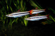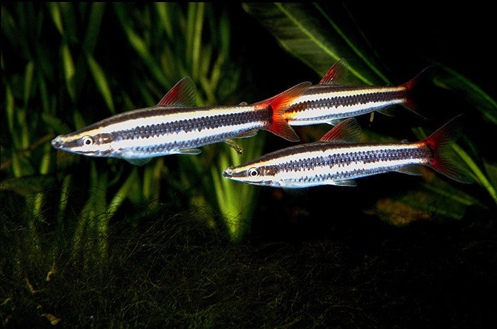 The Striped Headstander has a wide distribution throughout the Amazon and Orinoco River basins, and is known from rocky areas with rapidly flowing waters. Adults congregate in sizeable shoals and may be observed feeding on crustaceans, insects, plant matter, and worms. These fish attain a moderate size and require a spacious aquarium that measures at least 4ft x 18" x 18" (and preferably larger). Juveniles grow very quickly and should be given space from the outset in order to prevent stunting and associated health problems. The aquarium should be mature and aquascaped with a sand or small-grained, smooth gravel substrate, plenty of sturdy pieces of driftwood and an open swimming space along the front of the tank. Plants are not necessary, but will make the aquarium more aesthetically pleasing; however, as these fish will devour plants, it is essential to choose robust species such as Anubias spp. and Java Fern (Microsorum) that can be tied onto the decor. Of greater importance is the use of powerful filtration (ideally provided by external canisters) and a high level of oxygenation, perhaps provided by spray-bar returns situated above the water line and/or additional powerheads. High water quality is essential for this river-dwelling species, so partial water changes should be carried out on a very regular basis in order to keep nitrogenous waste to a minimum. Sturdy, tight fitting coverslides are requisite, as these fish are accomplished jumpers. Although gregarious in the wild, Striped Headstanders can be rather quarrelsome when maintained in small groups in aquaria. For this reason, it is necessary to keep either a single specimen, or a group of at least 8 individuals together (introduced simultaneously), as then any belligerent behaviour will be spread throughout the shoal, and no one fish will bear the continual brunt of any aggression. Tankmates could include medium-large sized peaceful cichlids (particularly rheophilic species), medium-sized characins, talking catfish (doradids) and suckermouth catfish (loricariids). Small fish will be eaten, and long-finned species will be nipped at, so choose tankmates with care. Anostomus anostomus is classified within the Family Anostomidae (headstanders), of which there are currently some 156 described species within 14 genera. Many species from this family swim at an oblique or head-down angle, hence the common family name of headstander.