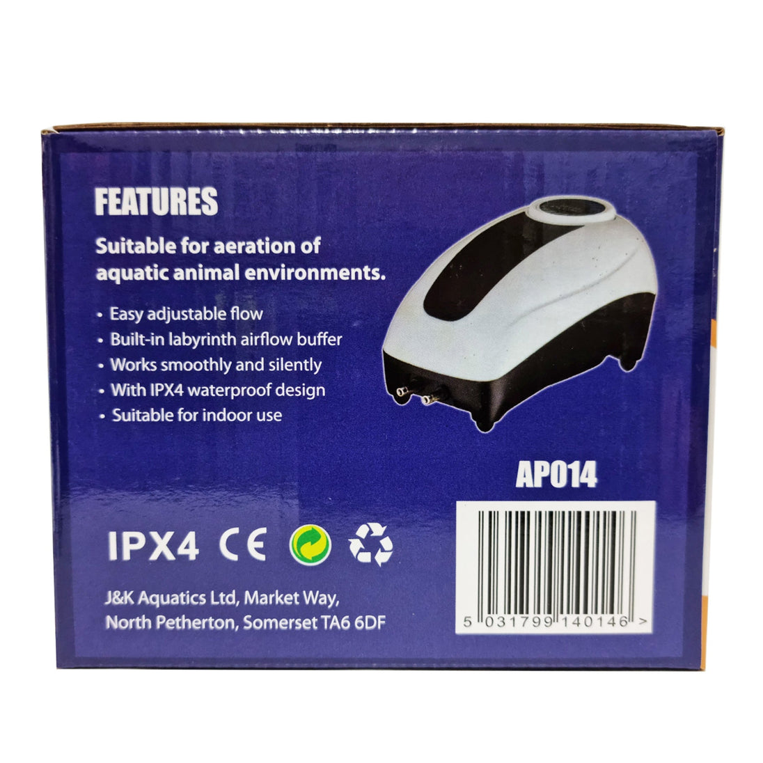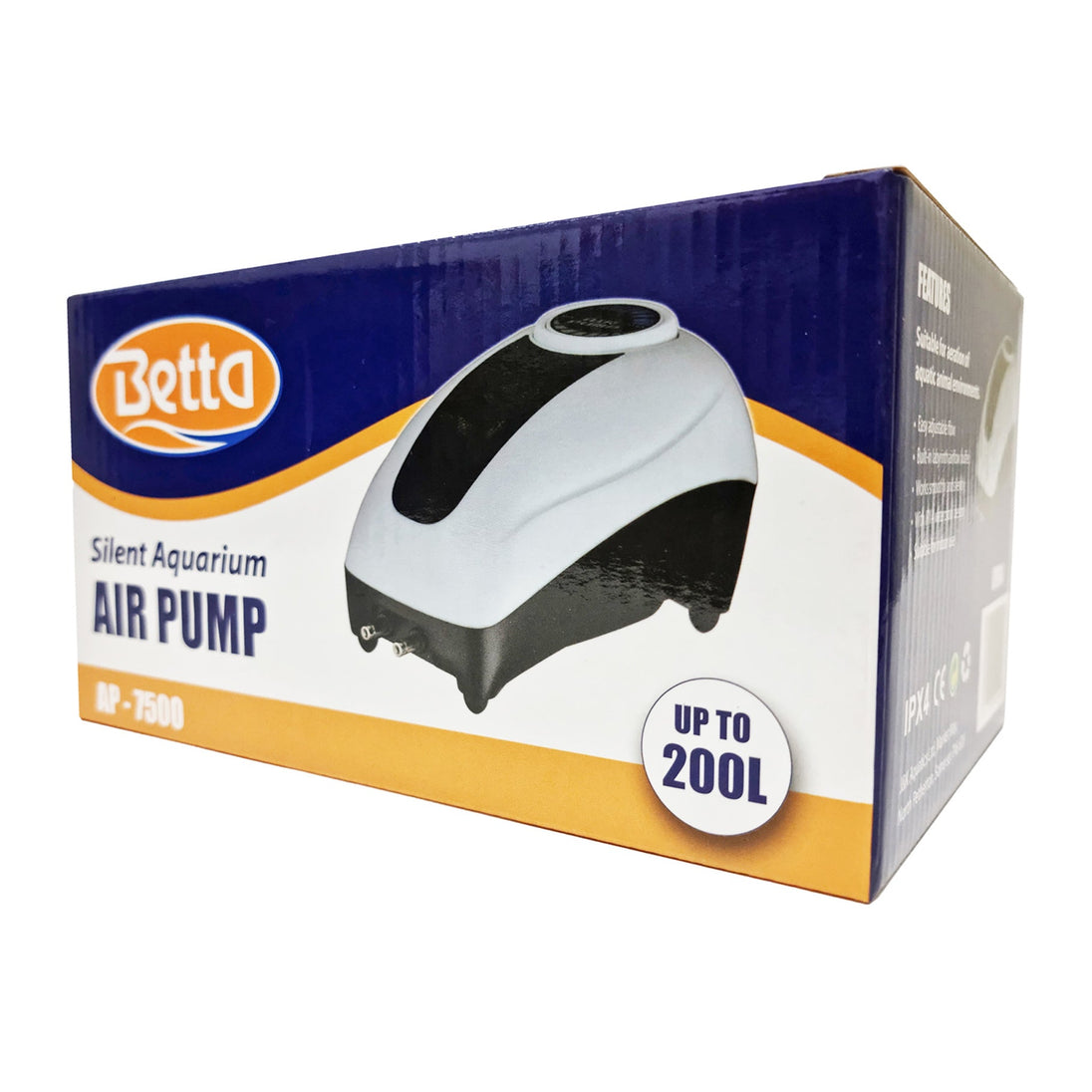 The Betta AP-7500 Silent Aquarium Air Pump is recommended for aquariums up to 200L. Suitable for use with standard 4/6mm airline and compatible accessories such as Betta Air stones, Air Curtains, air-operated aquarium ornaments, plus under-gravel and other air-driven filters (not included). It is great for increasing the oxygen levels in your aquarium.