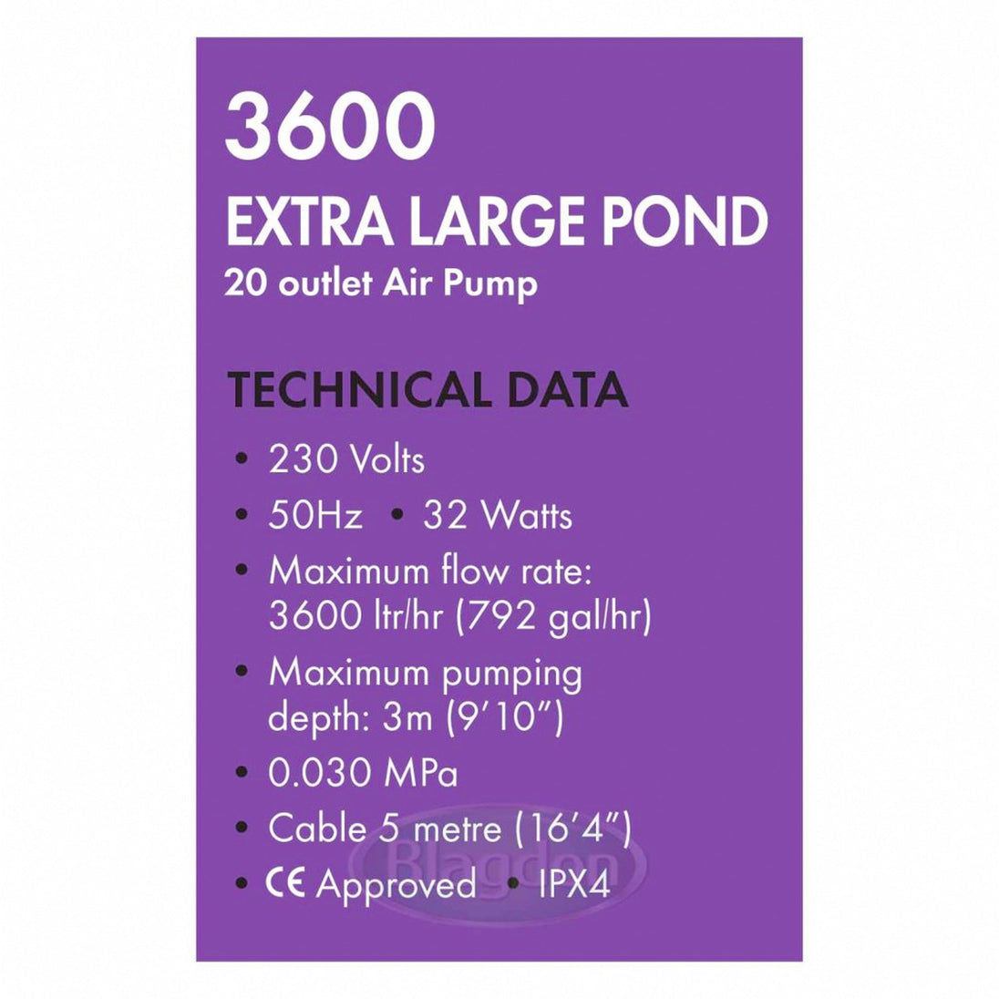 Blagdon Pond Oxygenator air pumps add essential aeration to maintain good pond water conditions and help keep fish healthy. Built to an outdoor, weather proof design, these pumps are very durable and feature a robust rubber diaphragm. Available in 6 sizes, from 140 to 3,600 litres per hour.