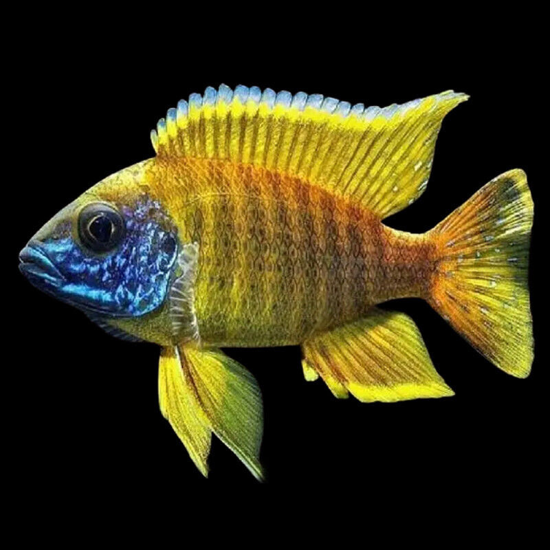 The Sunshine Peacock (Aulonocara maleri) is a visually striking species endemic to Lake Malawi in Africa. This vibrant fish is known for its stunning yellow-gold body with blue highlights around the mouth and dorsal fins, especially in males. Reaching sizes of 8 to 12 cm (3.15 to 4.72 inches) in captivity, Sunshine Peacocks are peaceful but can exhibit territorial behavior, especially males during breeding. Despite their beauty, these fish are best suited for intermediate to experienced aquarists due to their specific care requirements and territorial tendencies during spawning.