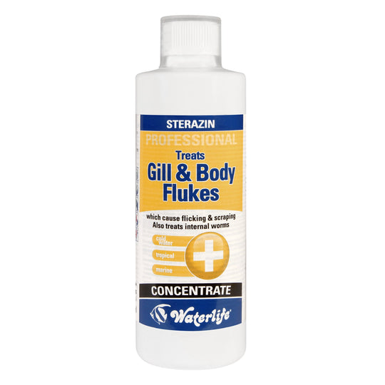 Vendor: Fishcave Aquatics Waterlife Gills And Body Flukes C+ 500ml Waterlife Sterazin Professional stops fish flicking and rubbing. This highly concentrated product that is widely used by the trade treats gill and body parasites along with internal worms in most tropical and cold water fish. Sterazin...Regular price £12.99