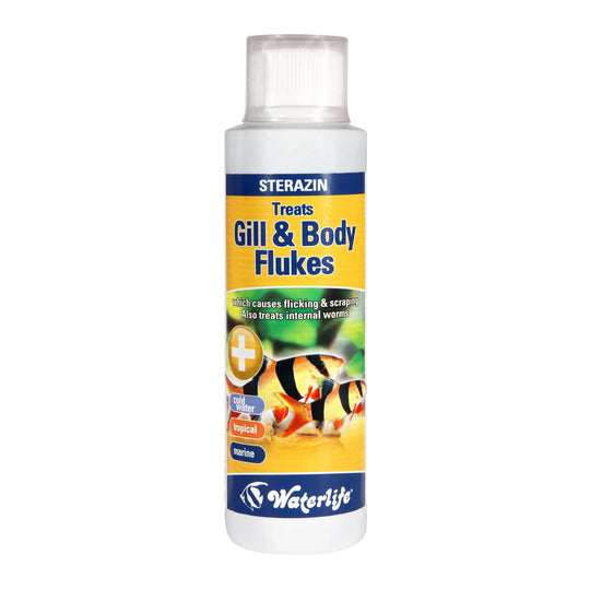 Vendor: Fishcave Aquatics Waterlife Sterazin For Gill & Body Flukes - Available In 2 Sizes Waterlife Sterazin stops fish flicking and rubbing. Treats gill and body parasites along with internal worms in most tropical and cold water fish. Sterazin should not be used with crustaceans, echinoderms, rays, seawater sharks, Piranha, Sturgeon...Regular price From £4.49
