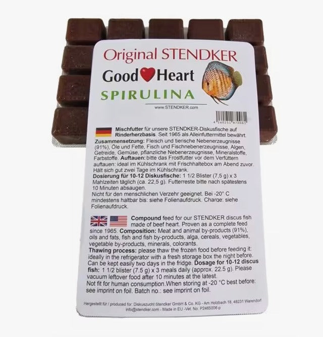 Stendker GoodHeart Spirulina is a renowned and specialized mixed frozen diet formulated for discus fish, with the added benefit of Spirulina algae. This frozen food has a beef heart base and has been trusted as a complete feed for discus fish for over five decades.