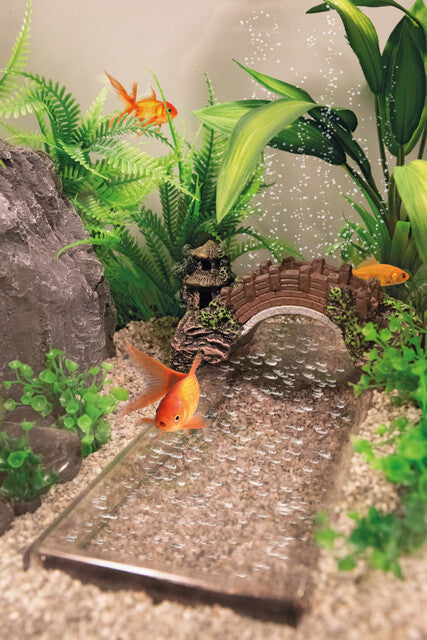The air bubbles imitate flowing water under the supplied bridge. The air bubbles will oxygenate the aquarium water. You connect the Deco Underwater River to an air pump, such as SuperFish Air-Flow 1 way (not included), to create air bubbles. The bubbles create the illusion of a flowing river.
